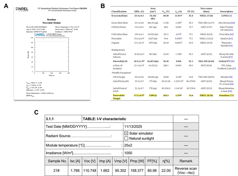 图3. 平米级钙钛矿光伏组件。(A)NREL认证钙钛矿光伏组件稳态效率17.2%(2024年钙钛矿商业组件效率世界纪录)。(B)太阳能电池世界纪录效率表(Version 65)。(C)最新TÜV南德认证效率达22%,再创新的世界纪录效率。