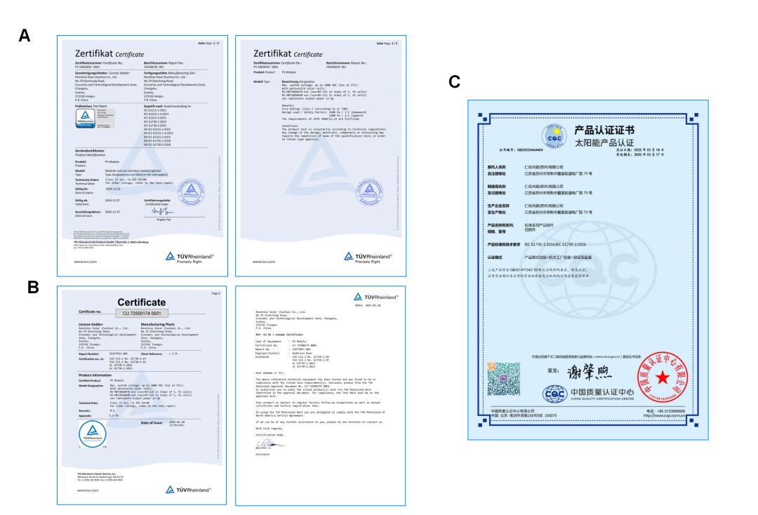 图4. 组件可靠性及质量认证。(A)德国莱茵TÜV全序列IEC认证证书。(B)美国UL认证证书。(C)中国质量认证中心产品认证证书。