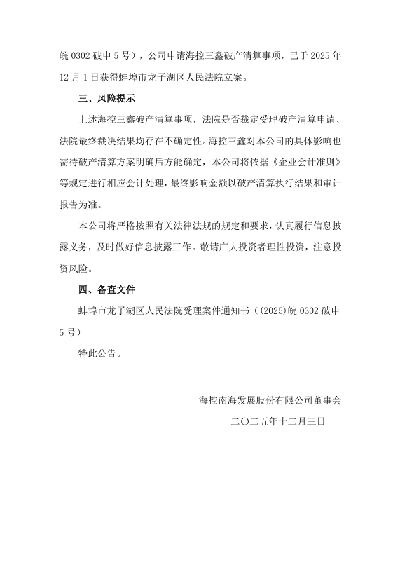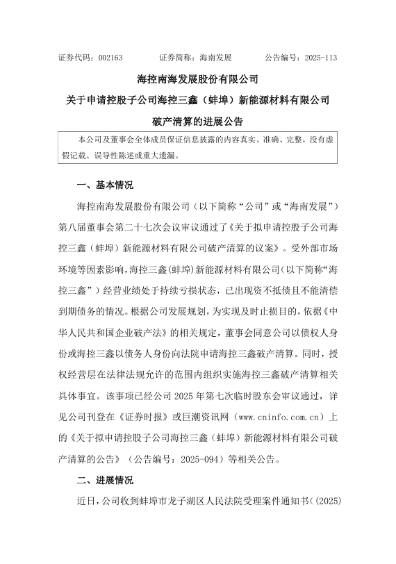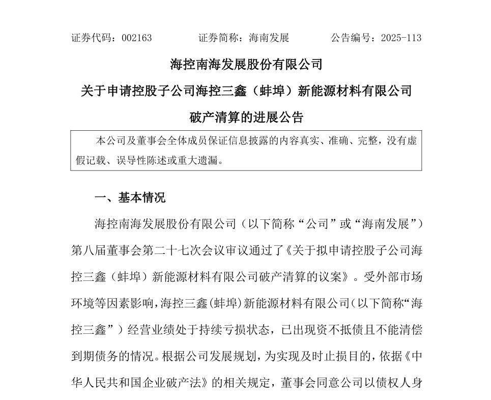 近日,海南发展(002163.SZ)发布公告披露,其控股子公司海控三鑫(蚌埠)新能源材料有限公司(下称“海控三鑫”)破产清算申请已于12月1日获法院立案。