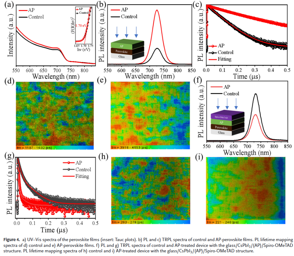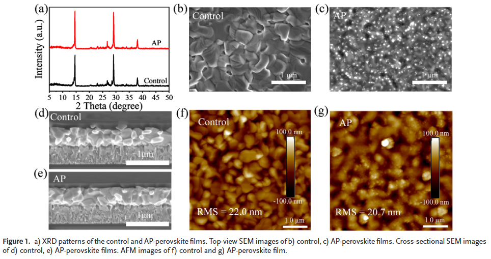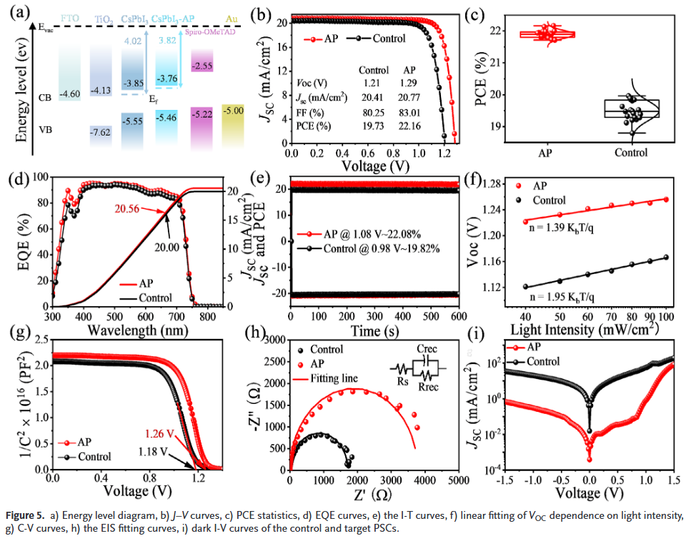 - 高效缺陷抑制与能级优化:AP处理显著提升薄膜结晶质量、降低陷阱态密度,并优化钙钛矿/空穴传输层能级对齐,实现高达22.16%的转换效率与1.29 V的高开路电压。