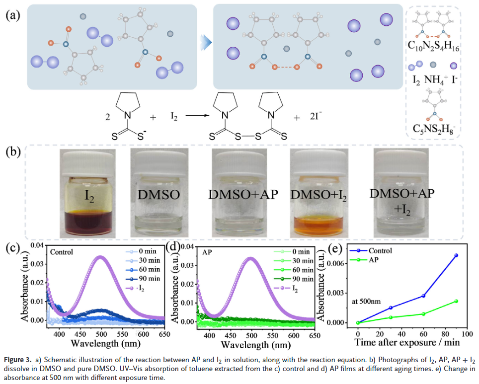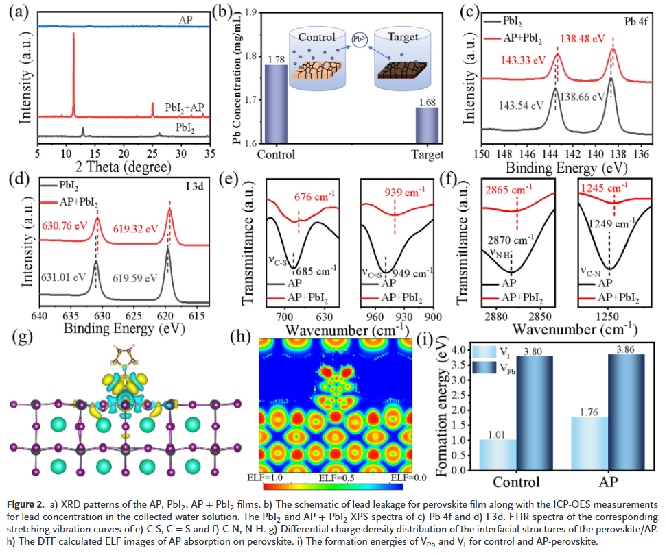 - 一石三鸟的多功能分子设计:AP分子同时具备强螯合(抑制铅泄露)、氢键结合(减少碘空位)和氧化还原(清除碘分子)三重功能,协同提升CsPbI₃薄膜的结构与界面稳定性。
