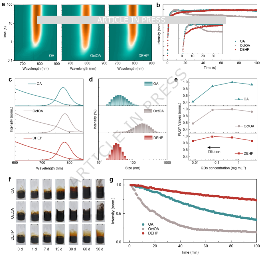 2. 熵配体设计兼具分散性与传输性DEHP的支链结构显著增加构型熵,提升量子点在溶液中的分散性与胶体稳定性;其强锚定磷酸头基团有效钝化表面缺陷,增强电荷传输,克服传统线性配体在“分散性-传输性”之间的权衡难题。