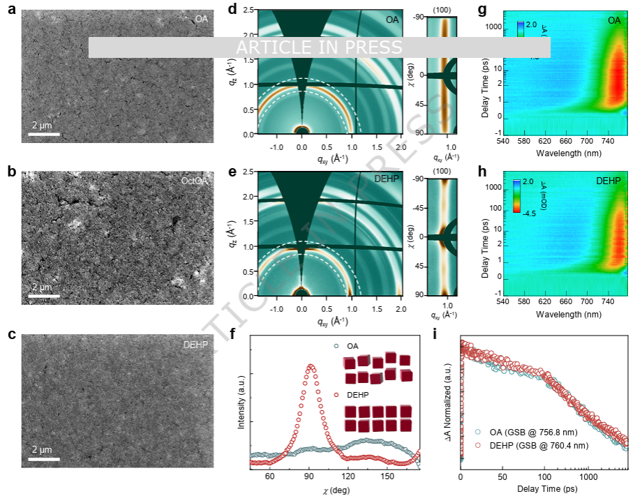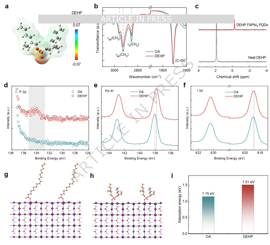 本文苏州大学袁建宇等人报道了一种高效的原位熵配体工程策略,使用双(2-乙基己基)磷酸酯(DEHP)来提升有机-无机杂化FAPbI₃量子点的分散性和电荷传输性能。DEHP的支链2-乙基己基尾部增加了构型熵,改善了溶剂相互作用和胶体稳定性。此外,其磷酸头锚定基团表现出更强的结合强度,增强了表面钝化并减少了量子点核间相互作用。