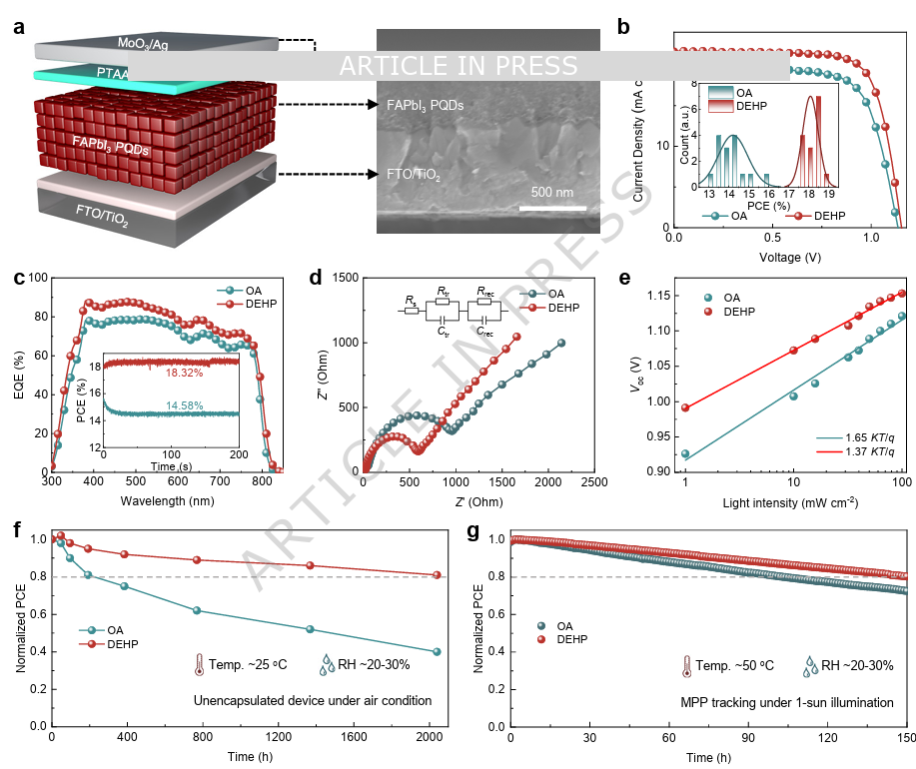 金属卤化物钙钛矿量子点(PQDs),特别是甲脒三碘化铅(FAPbI₃)量子点,因其理想的光学性能和稳定的相结构,在高效率太阳能电池中备受关注。然而,实现FAPbI₃量子点理想的胶体分散性和电荷传输仍具挑战。