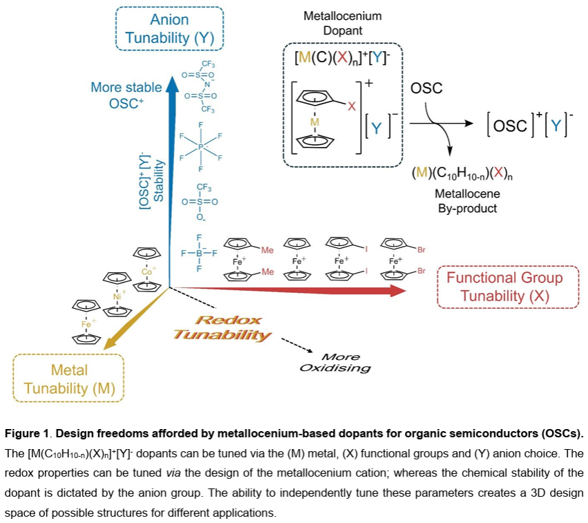 - “可调控”掺杂剂设计新策略提出基于金属茂盐([M(Cp)₂]⁺[Y]⁻)的掺杂剂平台,可独立调控阳离子(通过改变金属中心M或环上官能团X)以精确匹配OSC的氧化电位,同时调控阴离子(Y)以优化掺杂效能与稳定性,为有机半导体掺杂提供了高度灵活的设计空间。