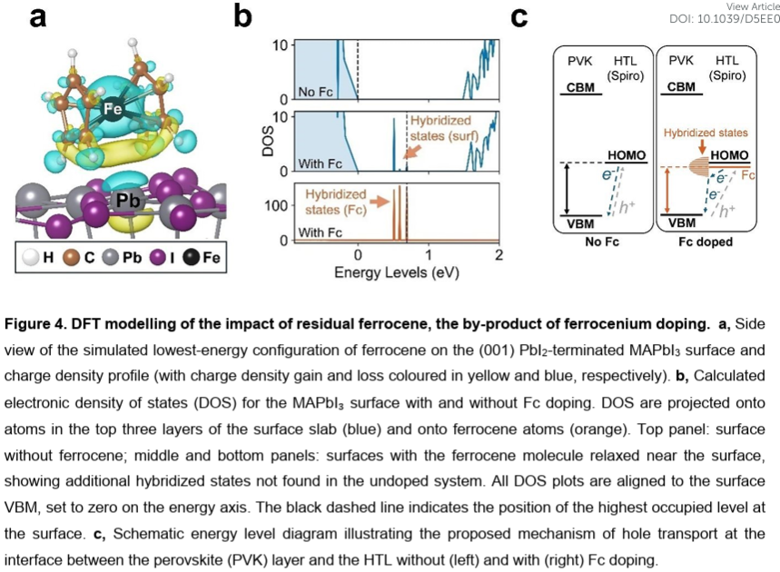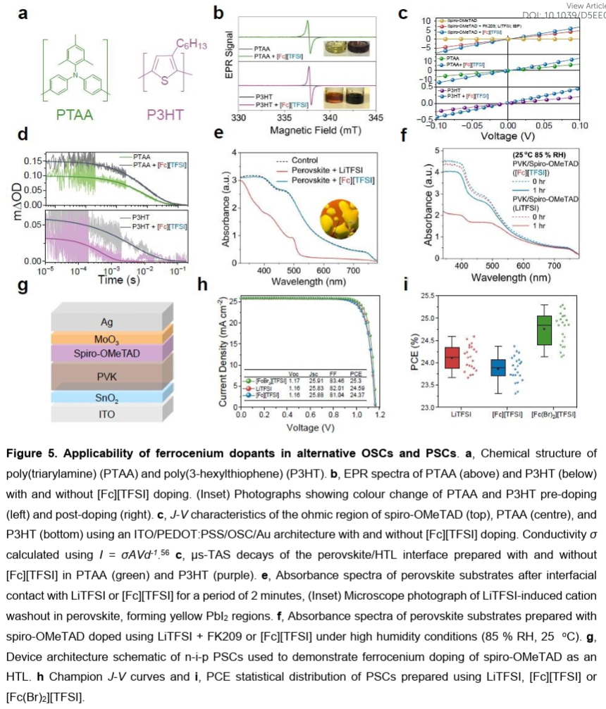 - 高效、无锂、空气稳定的钙钛矿太阳能电池使用优化的二茂铁盐(如[Fc(Br)₂][TFSI])完全替代传统吸湿、不稳定的LiTFSI和FK209共掺杂剂,制备的n-i-p结构钙钛矿太阳能电池实现了25.30%的最高效率(基准LiTFSI器件为24.59%),展现了卓越的性能替代潜力。