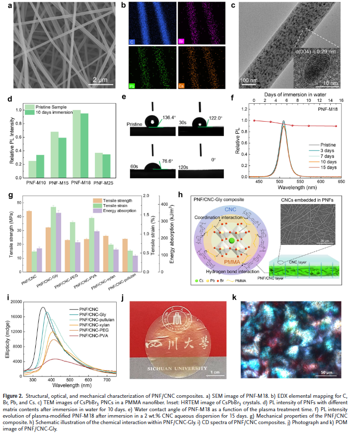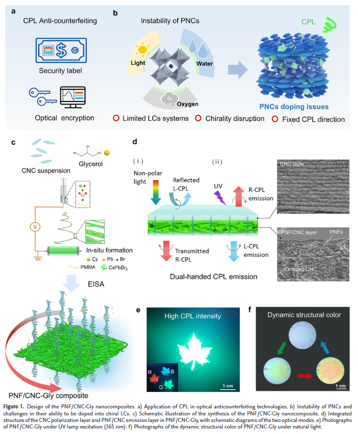 本文四川大学杨俊龙等人提出一种基于聚合物包覆钙钛矿纳米纤维的限域策略,将PNCs与水隔离,并支持纤维素纳米晶体(CNCs)原位自组装形成螺旋光子结构。所得固态复合材料表现出高光致发光量子产率(65.56%)、优异的机械强度(32.15 MPa),并在单一左手螺旋结构中实现宽范围不对称因子调控。重要的是,通过设计非对称双层结构的反射特性,该复合材料可实现依赖观察方向的双手机性圆偏振发光。