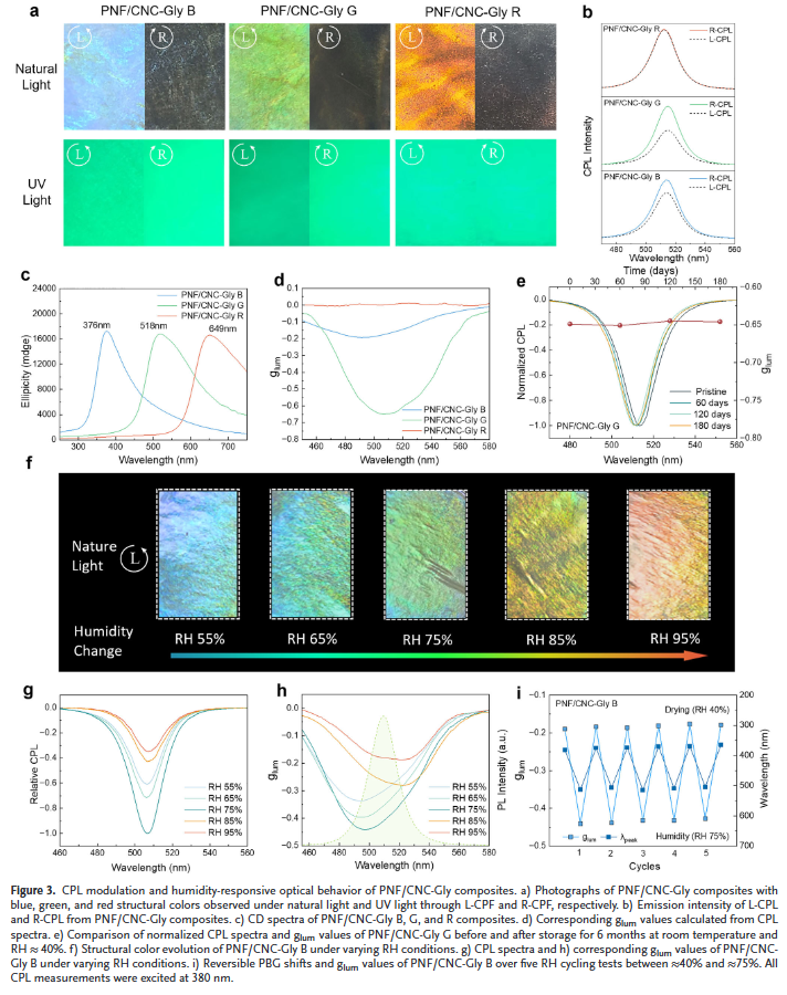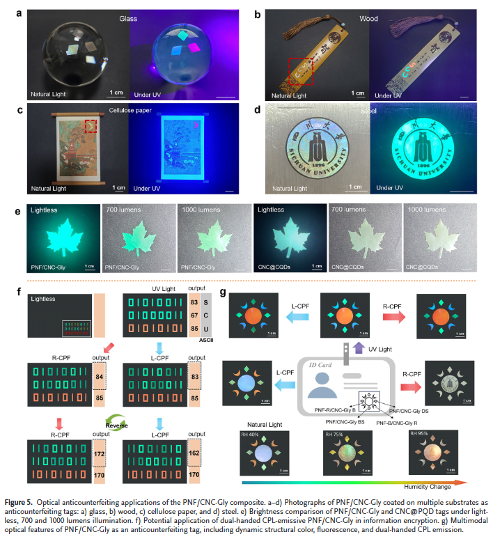 3. 多功能集成材料平台:材料同时具备高发光效率(PLQY >65%)、优异力学性能(拉伸强度 >32 MPa)、湿度响应结构色与CPL可逆调控,适用于多层次光学防伪与加密。