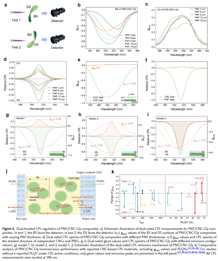 2. 单一左手结构中实现双向CPL可调:基于纤维素纳米晶体的螺旋光子结构与纳米纤维微腔共振耦合,实现了从同一材料两侧分别发射左、右手圆偏振光,不对称因子覆盖-0.96至+0.49。