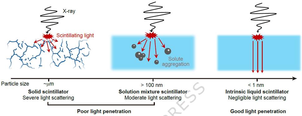 主流固体闪烁体中颗粒分布不均造成的光子散射是限制高分辨X射线成像的核心瓶颈。采用均匀透明的液体闪烁体在抑制光散射方面具有天然的优势。然而,少数已报道的液体闪烁体普遍依赖含铅的钙钛矿和有毒或易燃的有机溶剂,带来稳定性、安全性与生物相容性的问题。