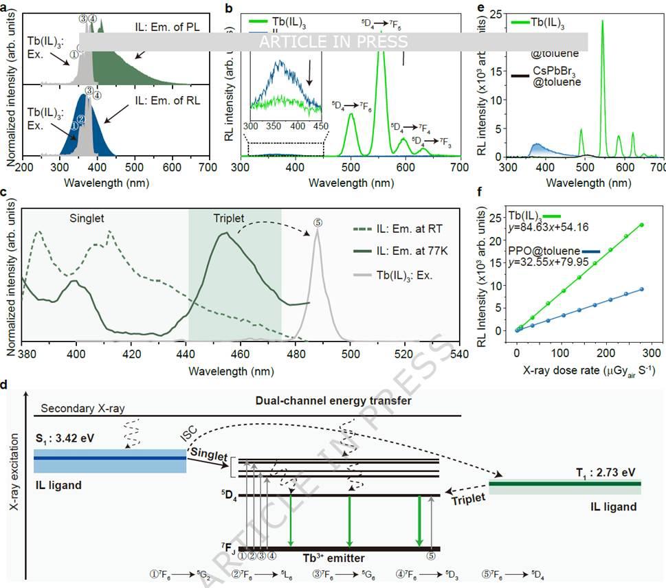 3. 机理拓展,从三线态到双通道能量转移。离子液体配体具有高度的结构灵活性,能够同时利用单线态和三线态有效地将能量传递并回收至镧系发光离子,从而显著提升闪烁强度。