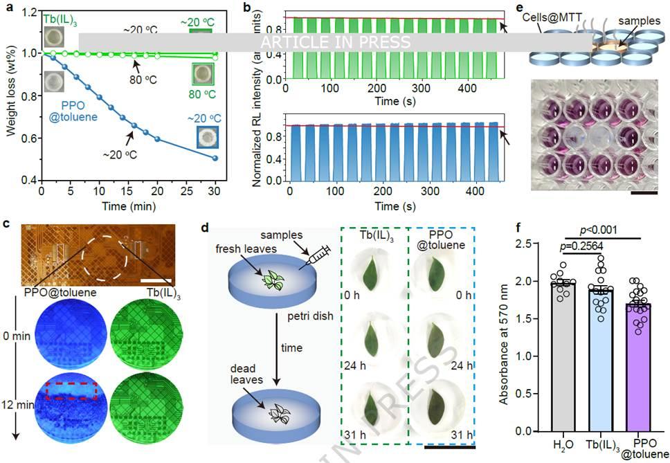 图5. 镧系-离子液体闪烁体的环境稳定性和生物相容性