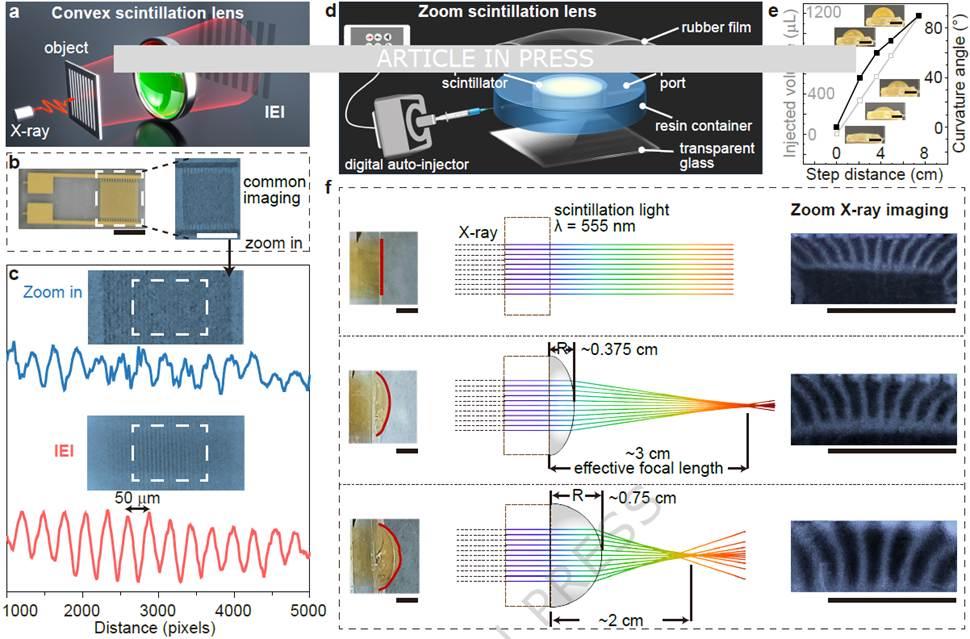 4. 功能延伸,从高分辨平面成像到凸面变焦闪烁透镜。在利用该体系无散射、无自吸收的优势获得平面高分辨X射线成像的基础上,进一步利用液体的流动性与形变能力,提出了可变焦闪烁透镜的概念,实现了传统固体闪烁体不可能实现的全角度均匀探测以及自适应原位放大成像。