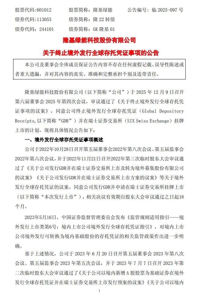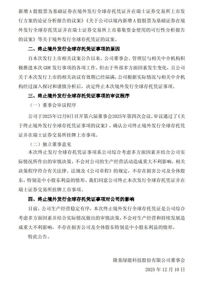隆基绿能表示,目前,公司生产经营稳定有序,本次终止境外发行全球存托凭证是公司综合考虑多方面因素并结合实际情况做出的审慎决策,不会对生产经营和持续发展造成重大不利影响,不存在损害公司及全体股东特别是中小股东利益的情形。