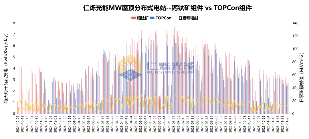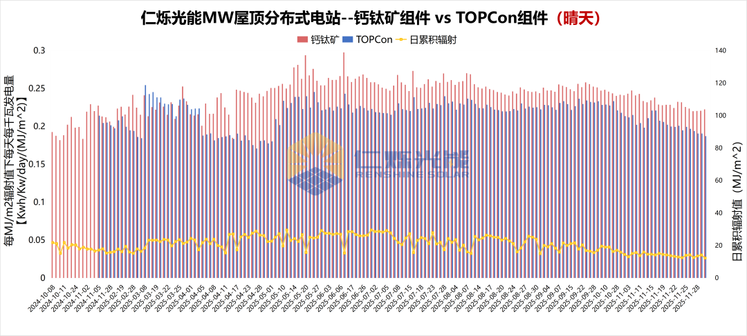 在辐照度相近(晴天)环境中,钙钛矿组件发电能力相当,无衰减趋势,整体优于晶硅组件。