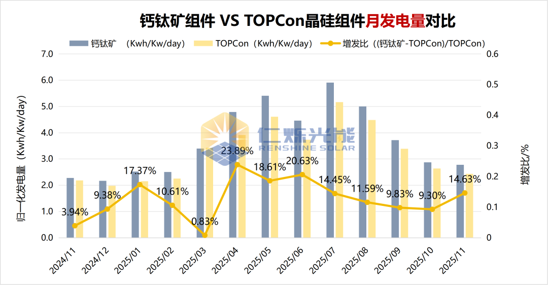 图3 钙钛矿组件对比TOPCon晶硅组件月发电量对比
