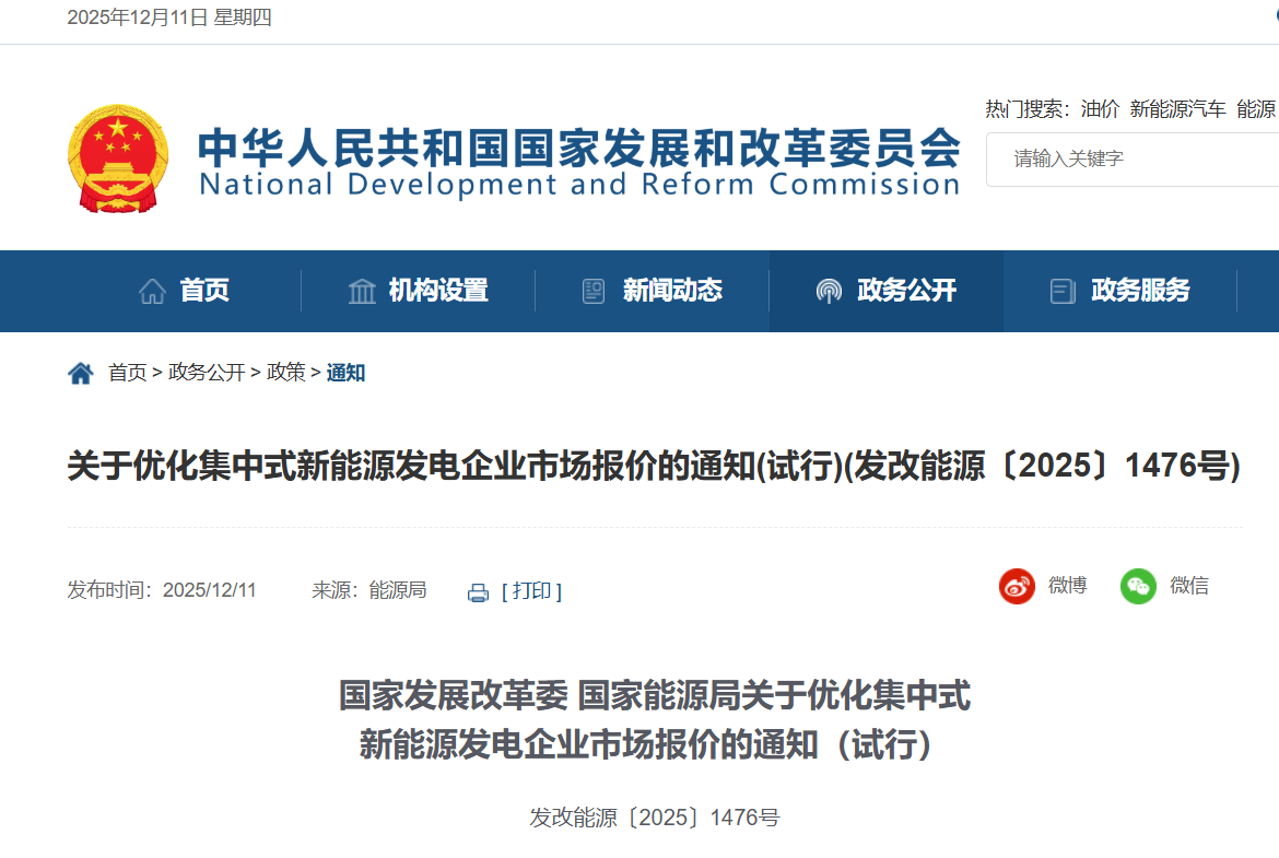 12月11日,国家发改委、国家能源局发布关于优化集中式新能源发电企业市场报价的通知(试行)。其中指出,参与集中报价的新能源发电企业,原则上集中后的总装机规模不应超过所在省(区、市)电力市场单个最大燃煤发电厂装机规模(不含特高压输电通道配套电源)。原则上仅允许同一集团(同一母公司、同一控股股东、同一实际控制人等)内同一省(区、市)的新能源发电企业进行集中报价,禁止跨集团、跨省(区、市)集中报价。禁止具有竞争关系的经营者达成固定或变更商品关系的垄断协议。