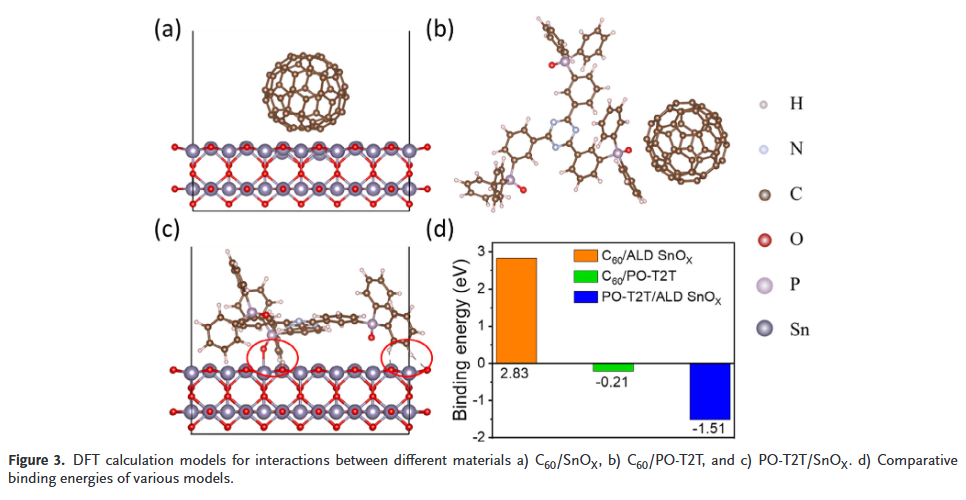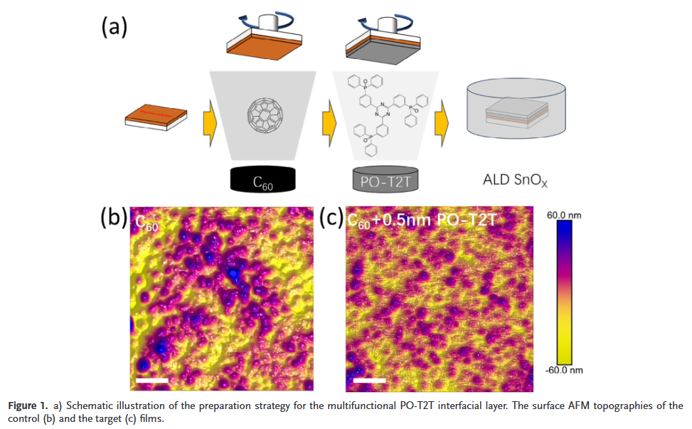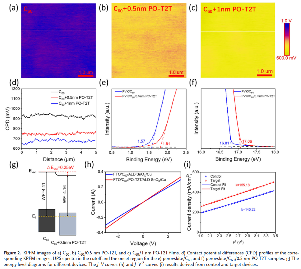 - 创新界面夹层设计:首次在C60与ALD‑SnOx间引入PO‑T2T超薄中间层,实现表面电势均匀化与能带对齐优化,显著提升电子提取驱动力。