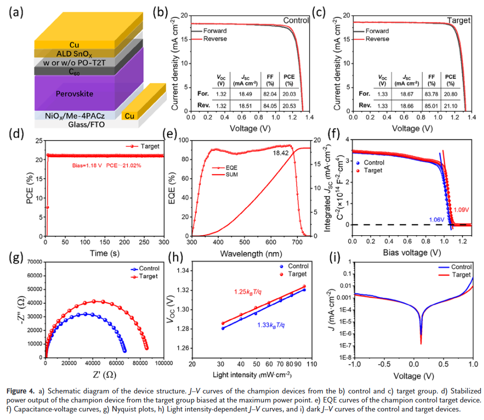 - 多重功能协同:PO‑T2T兼具分子桥接与缺陷钝化功能,不仅改善C60与SnOx的界面接触、促进SnOx均匀成核,还降低界面非辐射复合,大幅提升器件效率与稳定性。