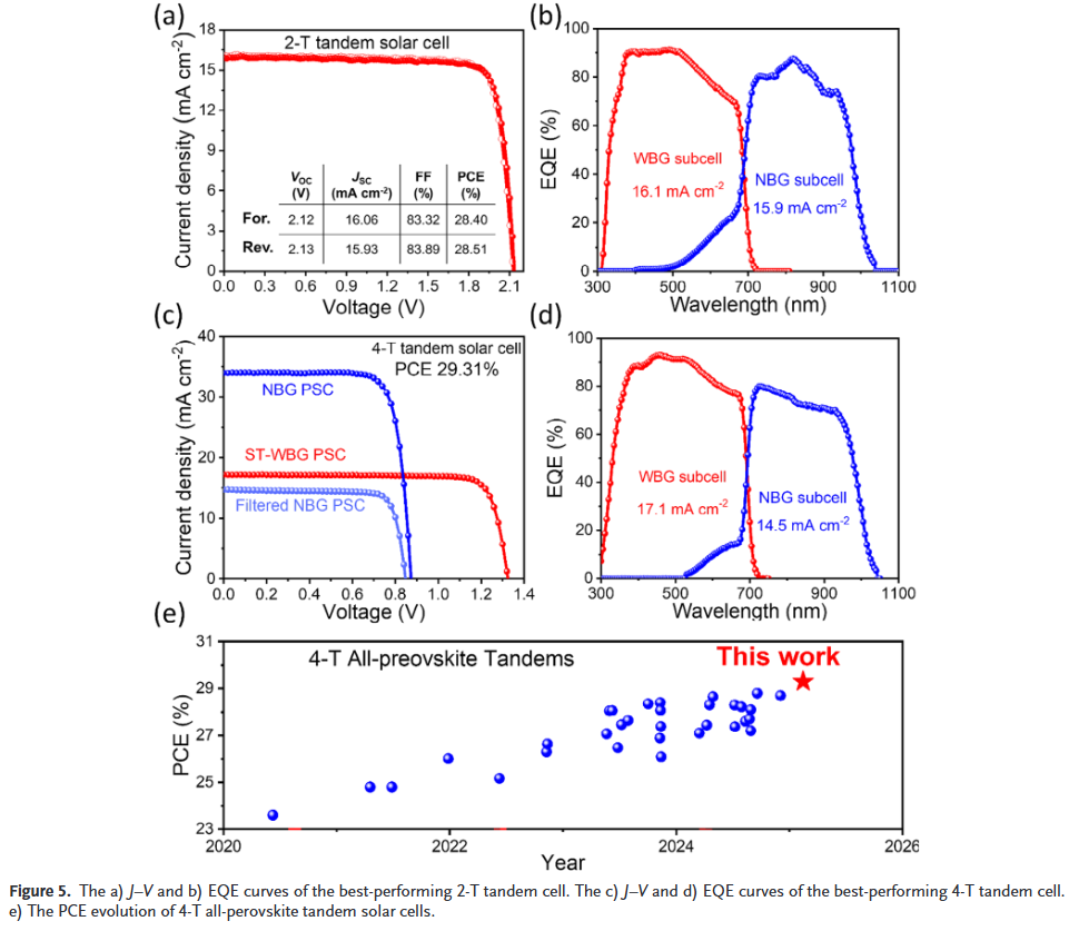 - 高效率叠层器件突破:基于该策略,宽带隙单结电池效率达21.1%,全钙钛矿双端与四端叠层电池效率分别突破28.5%与29.3%,处于领域领先水平。