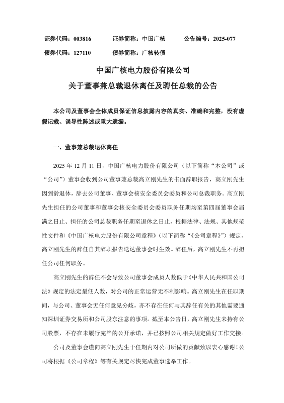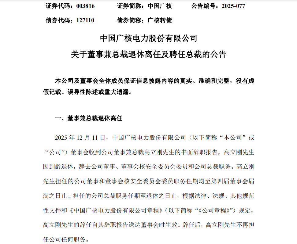12月11日晚,中国广核发布《关于董事兼总裁退休离任及聘任总裁的公告》。公告显示,2025年12月11日,中国广核电力股份有限公司(以下简称“本公司”或“公司”)董事会收到公司董事兼总裁高立刚先生的书面辞职报告,高立刚先生因到龄退休,辞去公司董事、董事会核安全委员会委员和公司总裁职务。