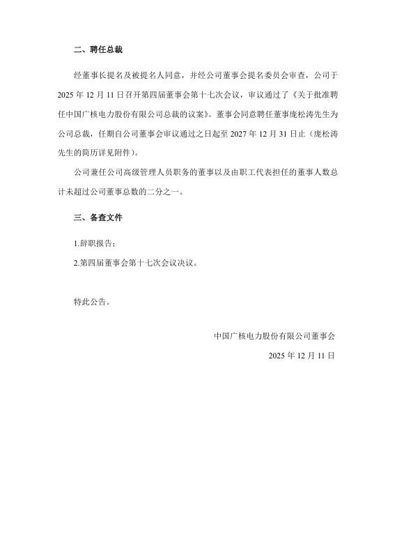经董事长提名及被提名人同意,并经公司董事会提名委员会审查,公司于2025年12月11日召开第四届董事会第十七次会议,审议通过了《关于批准聘任中国广核电力股份有限公司总裁的议案》。董事会同意聘任董事庞松涛先生为公司总裁,任期自公司董事会审议通过之日起至2027年12月31日止。