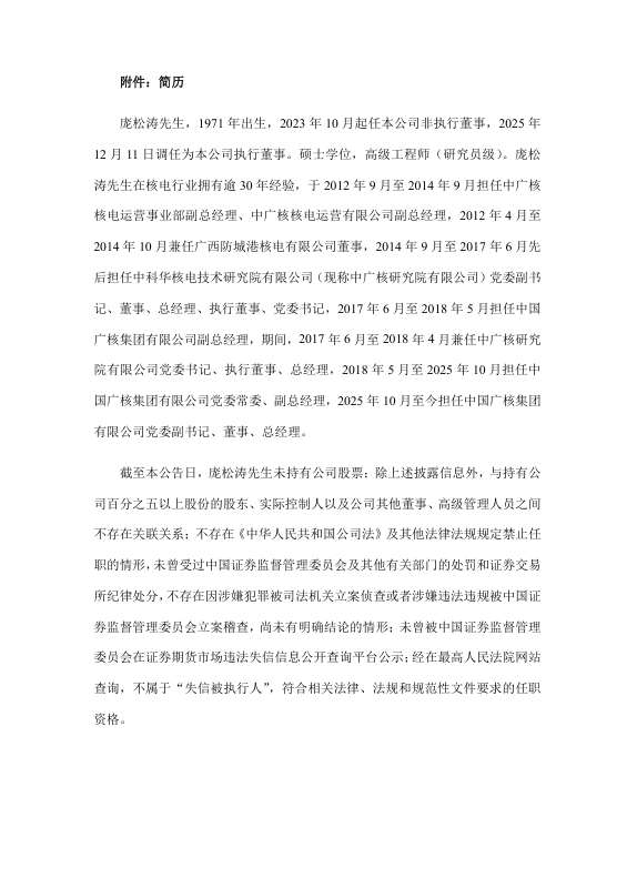 庞松涛,男,1971年出生,硕士学位,高级工程师(研究员级)。2023年10月起任本公司非执行董事,2025年12月11日调任为本公司执行董事。庞松涛先生在核电行业拥有逾30年经验,于2012年9月至2014年9月担任中广核核电运营事业部副总经理、中广核核电运营有限公司副总经理,2012年4月至2014年10月兼任广西防城港核电有限公司董事,2014年9月至2017年6月先后担任中科华核电技术研究院有限公司(现称中广核研究院有限公司)党委副书记、董事、总经理、执行董事、党委书记,2017年6月至2018年5月担任中国广核集团有限公司副总经理,期间,2017年6月至2018年4月兼任中广核研究院有限公司党委书记、执行董事、总经理,2018年5月至2025年10月担任中国广核集团有限公司党委常委、副总经理,2025年10月至今担任中国广核集团有限公司党委副书记、董事、总经理。