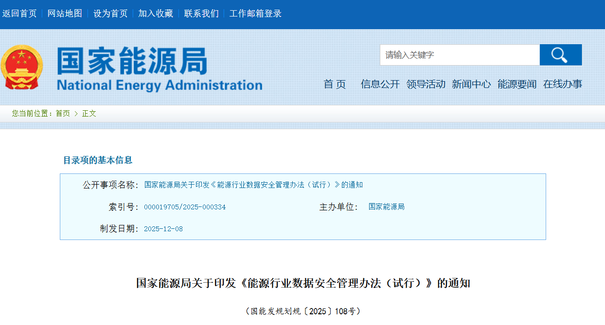 12月12日,国家能源局印发《能源行业数据安全管理办法 (试行)》,该办法自2026年7月1日起施行,有效期5年。
