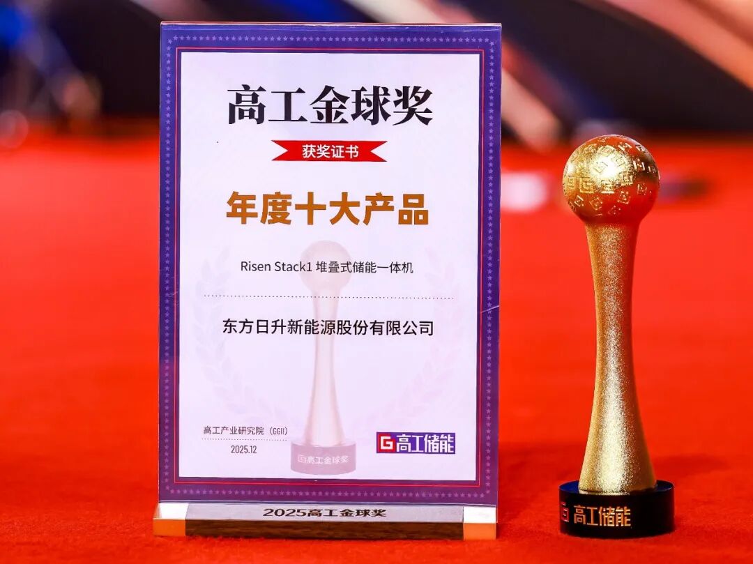 12月11日,2025高工储能金球奖颁奖典礼在深圳举行,东方日升工商业堆叠式储能一体机斩获高工金球奖2025年度十大产品奖。作为东方日升上半年推出的储能新品,此次获奖不仅是对产品硬核实力的高度认可,更彰显了公司在储能领域的技术积淀与行业影响力。