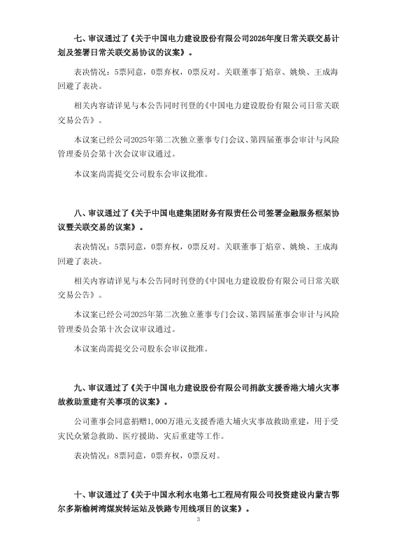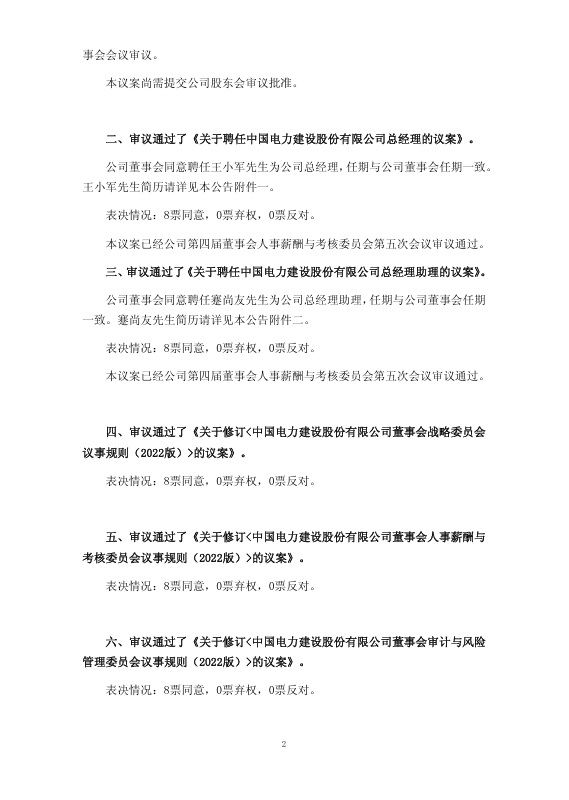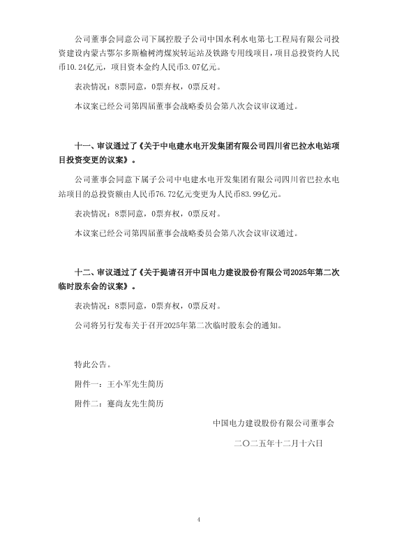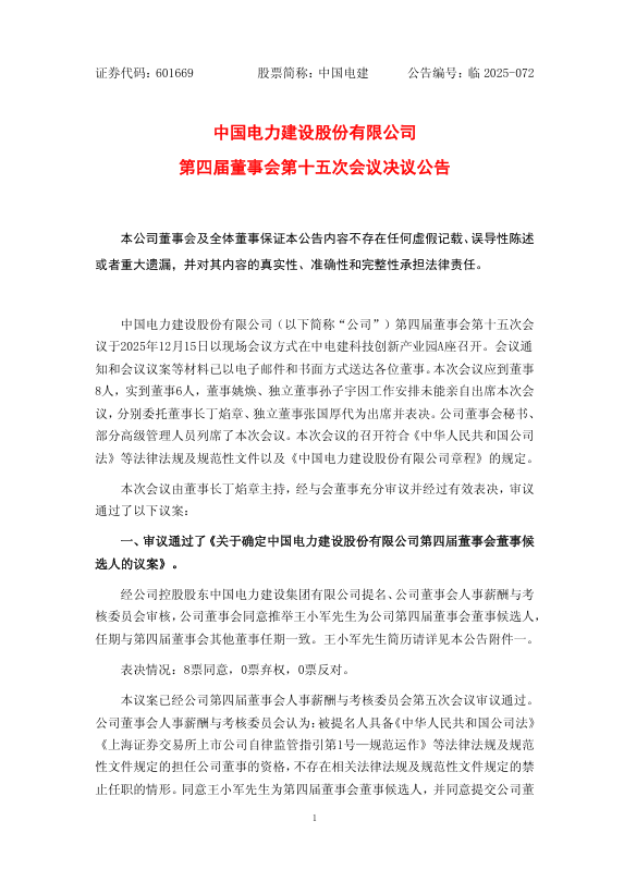 12月15日,中国电建公告称,经公司控股股东中国电力建设集团有限公司提名、公司董事会人事薪酬与考核委员会审核,公司董事会同意推举王小军先生为公司第四届董事会董事候选人,任期与第四届董事会其他董事任期一致。公司董事会同意聘任王小军先生为公司总经理,任期与公司董事会任期一致。