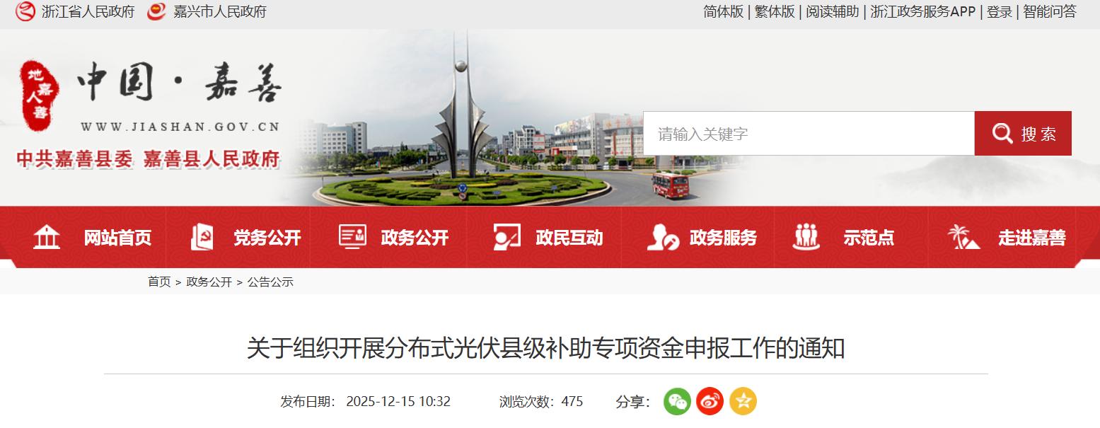 根据《嘉善县人民政府办公室关于推进分布式光伏发展的若干意见》(善政办发〔2022〕25号)、《嘉善县分布式光伏发电项目县级补助资金操作细则》(善发改〔2023〕21号)、《嘉善县分布式光伏县级补助专项资金管理办法》(善发改〔2025〕131号)等文件精神,现组织开展分布式光伏县级补助专项资金申报工作,有关事项通知如下: