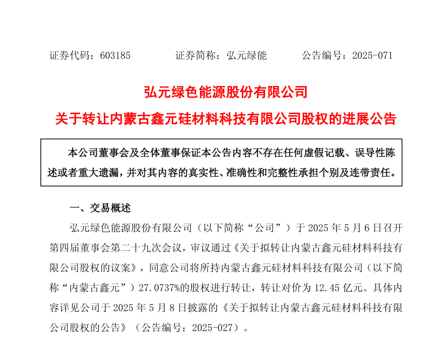 近日,弘元绿能(603185.SH)发布公告,宣布其转让内蒙古鑫元硅材料科技有限公司(下称“内蒙古鑫元”)27.0737%股权的交易已全部完成,公司不再持有该标的股权。