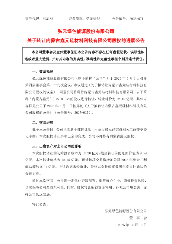 公告显示,该笔股权转让对价为12.45亿元,弘元绿能已全额收到转让款,且标的公司已完成工商变更登记。财务数据显示,此次交易初始投资成本10.20亿元,转让前账面价值9.54亿元,预计将为公司2025年度合并利润总额增厚约2.91亿元,同时补充现金流支持长远发展。