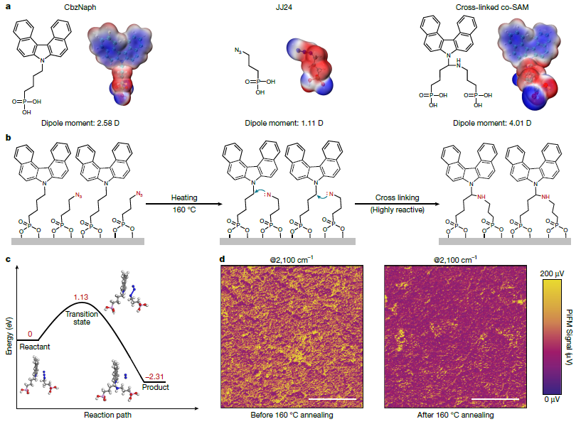 近日,发表于《Nature》的一项研究通过引入可交联的自组装单分子层(SAM)技术,成功制备出认证效率高达26.92%的钙钛矿太阳能电池,并展现出超卓的热稳定性(85°C下连续工作1,000小时效率几乎无衰减)。本研究中太阳能电池器件结构为FTO/SAM/钙钛矿/EDAI₂/C₆₀/ SnOₓ /Ag,作者使用Arradiance公司的GEMStar系列台式原子层沉积ALD系统制备了其中的电子传输层(20 nm厚的SnOₓ薄膜)及封装层(10 nm的Al2O3)。研究者设计了一种含叠氮基团的客分子JJ24,将其与主SAM分子CbzNaph共沉积后,通过热退火触发交联反应,形成共价连接的“增韧”SAM层。该交联结构显著增强了SAM层的构象稳定性,抑制了因分子热摆动导致的基底暴露,从而有效防止了钙钛矿与TCO基底接触引发的分解。同时,交联SAM具有更高的分子偶极矩,能更好地调控界面能级对齐,提升空穴提取效率。