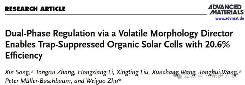 Xin Song, Tongrui Zhang, Weiguo Zhu*, et al. Dual-Phase Regulation via a Volatile Morphology DirectorEnables Trap-Suppressed Organic Solar Cells with 20.6%Efficiency. Adv. Mater. 2025, e20162.