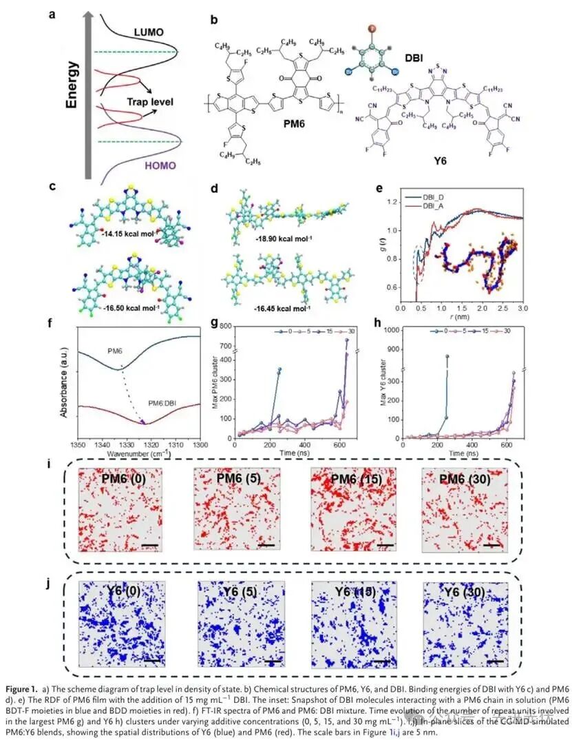 3. 多重表征验证机制,精准解析构效关系:整合CG-MD模拟、原位GIWAXS/PL/LS、IR-AFM 等技术,实时捕捉薄膜形成过程中分子堆积与相分离演变,明确DBI与PM6的选择性结合(结合能 18.90 kcal/mol)是形态优化的核心驱动力。