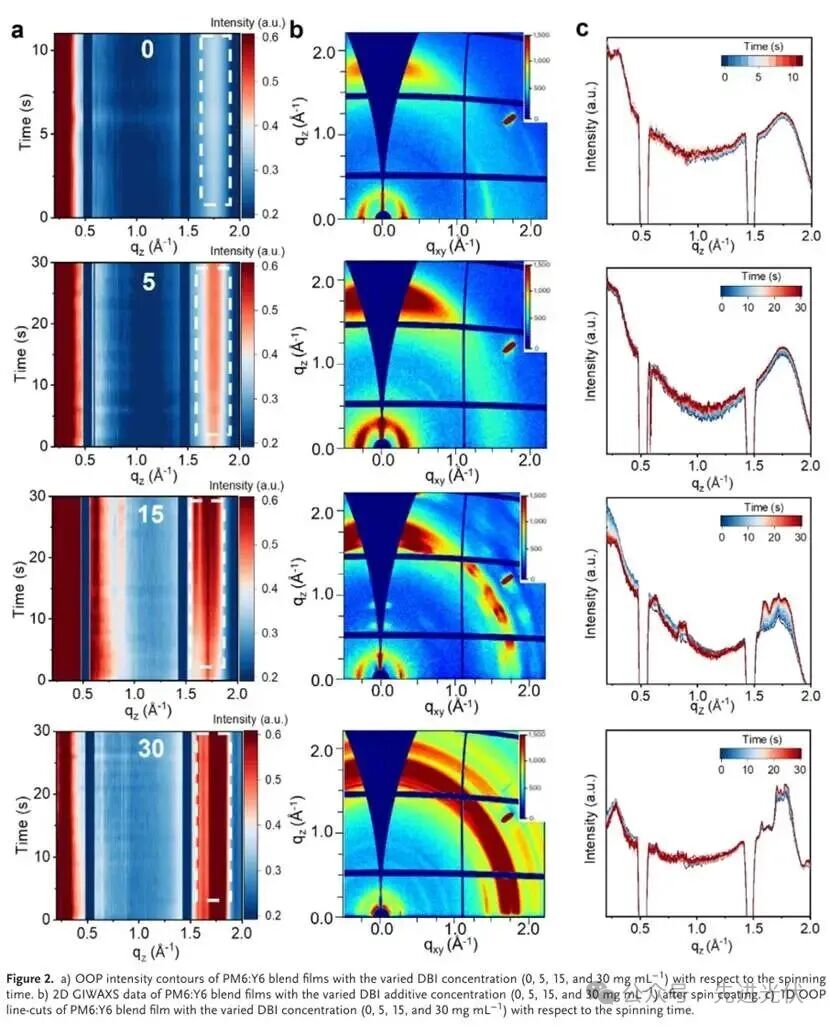 通过原位掠入射广角X射线散射(GIWAXS)实时监测了不同DBI浓度下PM6:Y6共混薄膜在旋涂成膜过程中的结构演化。结果显示,适量DBI(5和15 mg mL⁻¹)的加入显著增强了薄膜的结晶有序性,表现为面外(010)π-π堆积峰的散射强度与相干长度同步增加,表明分子堆积更为紧密。而过量DBI(30 mg mL⁻¹)则导致衍射信号弥散、强度减弱,表明其强烈的自聚集行为破坏了初始分子排列,诱导形成无序的非晶态结构。
