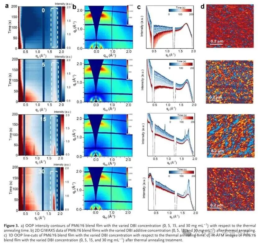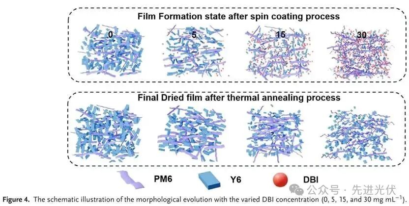 在无添加剂(0 mg mL⁻¹)时,Y6的过度聚集与PM6的弱结晶导致相分离过大,形成大量缺陷。加入适量DBI(5-15 mg mL⁻¹)后,溶液中的DBI优先诱导PM6预聚集,在成膜初期构建出连续的给体纤维网络,该网络作为模板有效限制了Y6的聚集尺寸,最终经热退火形成具有理想互穿结构的双连续相分离形貌。然而,当过量的DBI(30 mg mL⁻¹)加入后,其自身的强烈自聚集在成膜过程中便破坏了给受体分子的有序堆积,导致退火后的薄膜呈现相边界模糊、结构无序的状态。该图清晰地揭示了DBI浓度通过分步调控溶液聚集与薄膜固化动力学,最终决定活性层纳米结构的完整路径。