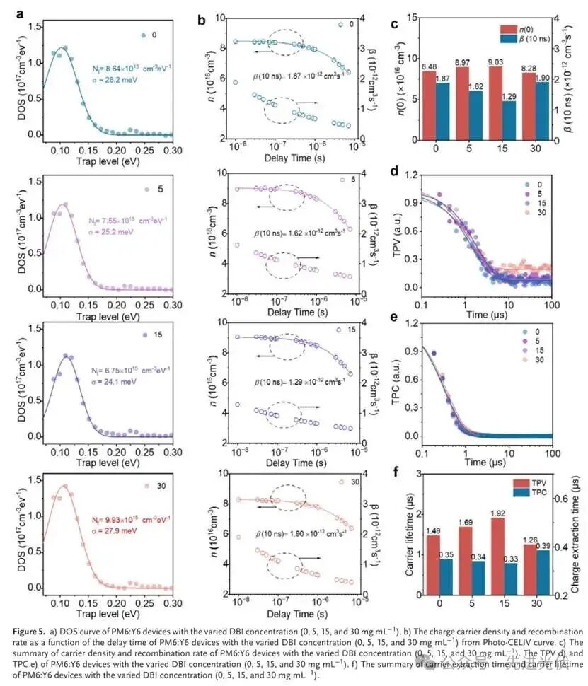 图a的态密度(DOS)分析表明,15 mg mL⁻¹ DBI处理将陷阱密度最低降至6.75×10¹⁵ cm⁻³,同时能量无序度(δ)最小,证实其优化形貌可有效抑制缺陷态。Photo-CELIV结果显示,在此浓度下载流子生成量提升,而双分子复合系数(β)降至最低1.29×10⁻¹² cm³ s⁻¹,表明非辐射复合被显著抑制。TPV/TPC测试(d-f)进一步证实,最优器件具有最长的载流子寿命(1.92 μs)和最短的提取时间,体现了平衡且高效的电荷传输。