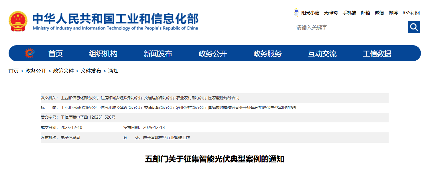 工业和信息化部办公厅 住房和城乡建设部办公厅 交通运输部办公厅 农业农村部办公厅 国家能源局综合司关于征集智能光伏典型案例的通知