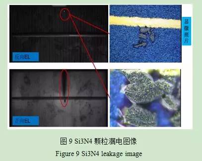 Si3N4颗粒有可能造成漏电如图9所示,Si3N4颗粒主要来源:1)铸造多晶硅时在坩埚表面喷涂的Si3N4脱落融入硅锭所致;2)镀膜时SiH4的含量偏高,形成Si3N4颗粒。Si3N4颗粒的晶粒贯穿电池片的层错,使PN结导通而导致漏电。